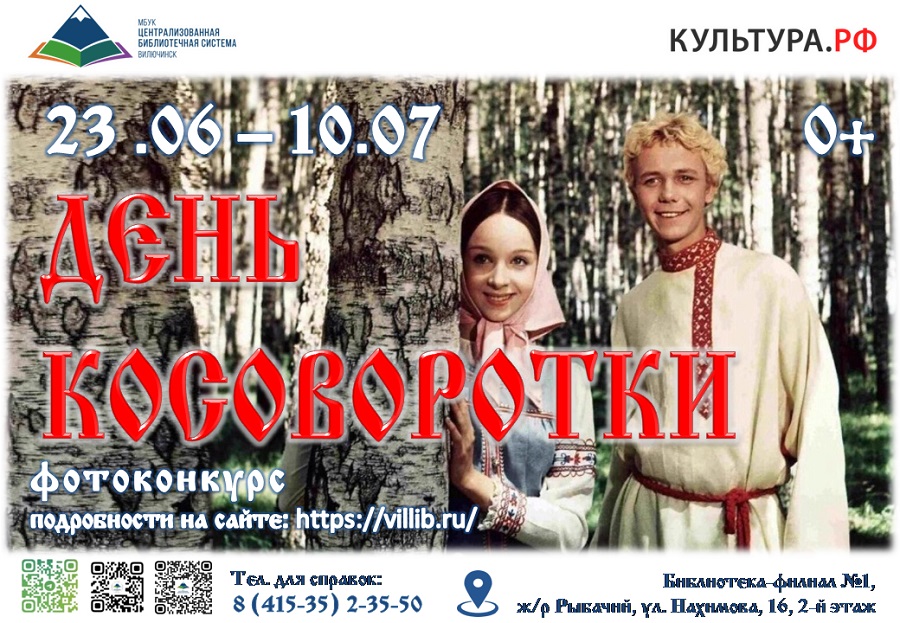С 23 июня по 10 июля библиотека-филиал № 1 приглашает жителей города принять участие в фотоконкурсе, посвященном празднику, который отмечается 12 июля, – Дню косоворотки. Для участия в конкурсе требуется прислать организаторам фотографию в традиционном русском костюме (или элементах костюма). Адрес электронной почты библиотеки: bibvil1@yandex.ru, телефон для отправки фотографий в мессенджере WhatsApp: +7-914-624-19-24. Дополнительно необходимо указать ФИО и контактные данные участника. Срок приёма фотографий – с 23 июня по 01 июля. Положение о конкурсе размещено по ссылке. Адрес библиотеки-филиала № 1: ул. Нахимова 16, 2 этаж. ☎ для справок: 8 (415-35) 2-35-50.