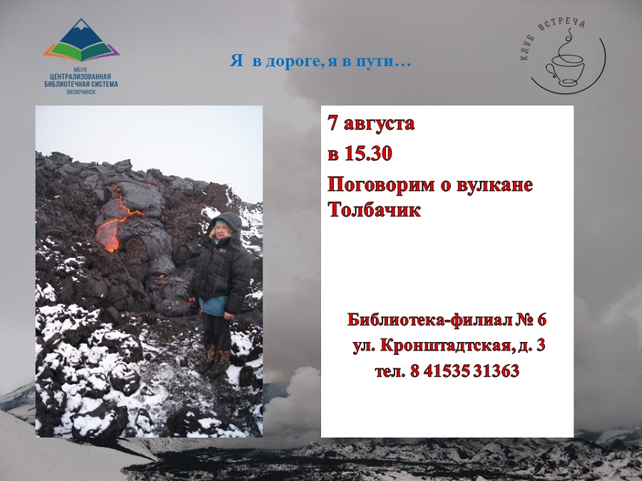 7 августа в 15:30 в библиотеке-филиале № 6 состоится встреча, темой которой станет один из знаменитых камчатских вулканов – Плоский Толбачик – и большое трещинное извержение 2013 года. Участник событий, побывавший в тех местах в момент извержения вулкана, поделится своими впечатлениями, покажет фотографии. Вулканизм – это прежде всего грозное, подчас катастрофическое явление природы. В фонде библиотеки представлены книги, посвященные камчатским вулканам и землетрясениям. Адрес библиотека-филиал № 6: ул. Кронштадтская, 3. ☎ для справок: 8(415-35)3-13-63.