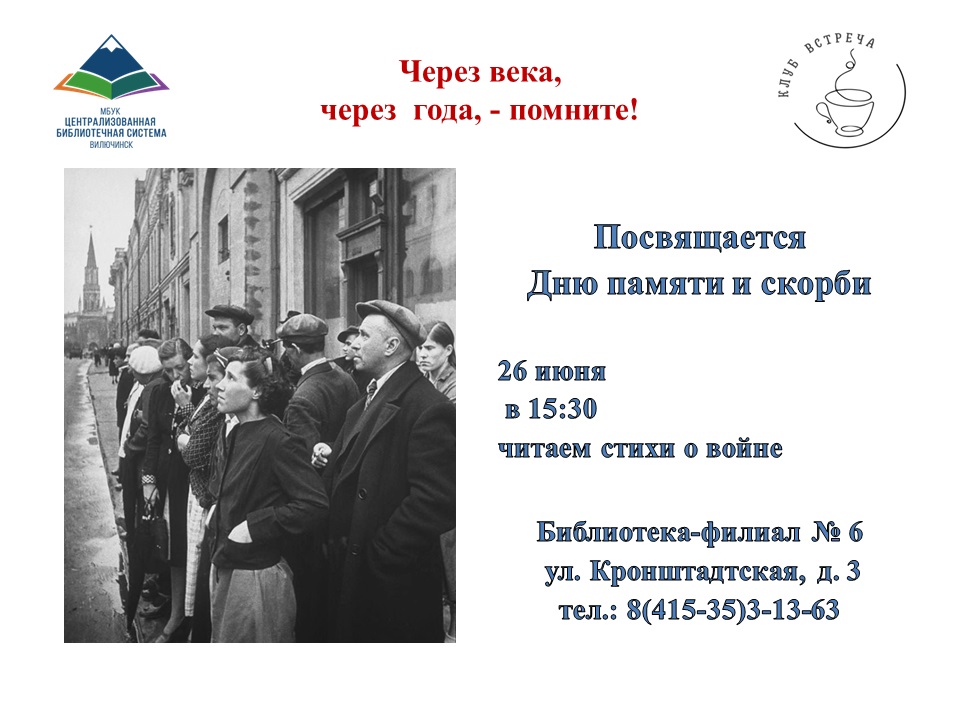 26 июня в 15:30 в библиотеке-филиале № 6 состоится встреча, участники которой будут читать стихи о Великой Отечественной войне, о Родине и о герояъх Памяти наших отцов и старших братьев, памяти вечно молодых Приглашаются все желающие Адрес библиотеки-филиала № 6: ул. Кронштадтская, д. 3. ☎ для справок: 8(415-35)3-13-63.