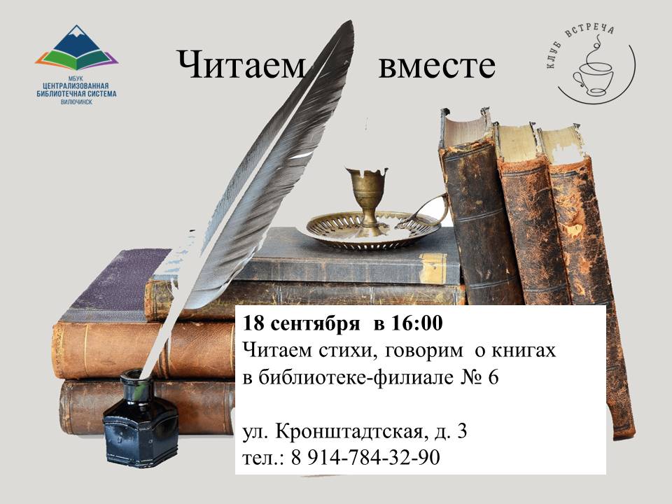18 сентября в 16:00 в библиотеке-филиале № 6 состоится очередное заседание клуба «Встреча». Библиотека запускает новый проект «Читаем вместе». Это серия увлекательных встреч, где участники рассказывают о важных книгах в их жизни. Гости мероприятия поделятся воспоминаниями о любимых книгах, сыгравших важную роль в формировании мировоззрения. Адрес библиотеки-филиала № 6: ул. Кронштадтская, 3. ☎ для справок: 8-914-784-32-90 (руководитель клуба «Встреча» Елена Юрьевна Романенко).