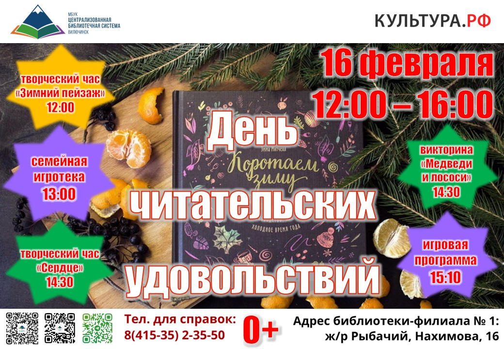 16 февраля с 12:00 до 16:00 библиотека-филиал № 1 приглашает горожан провести семейный выходной день за играми и занятиями творчеством. В 12:00 программу мероприятий откроет творческий час «Зимний пейзаж». В 13:00 начнется семейный турнир по настольным играм «Игра столов» – замечательный способ расширить кругозор, пополнить словарный запас, улучшить логическое мышление, а также хороший способ весело провести досуг. В 14:30 будут организованы творческий час «Сердце» и викторина «Медведи и лососи». В них смогут принять участие дети от 6 лет или дети вместе с родителями. В 15:10 начнётся игровая программа для всех возрастов. Фотозона, подарки, сладкие призы и хорошее настроение гарантированы! Адрес библиотеки-филиала № 1: ул. Нахимова, 16, 2-й этаж. ☎ для справок: 8(415-35)2-35-50.
