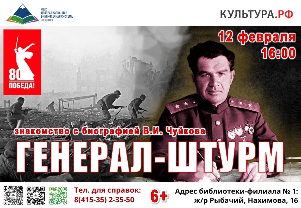 12 февраля в 16:00 библиотека-филиал № 1 приглашает жителей города на знакомство с биографией В.И Чуйкова – легендарного военачальника, дважды Героя Советского Союза, имя которого навечно вписано в историю Великой Отечественной войны. В ходе мероприятия участники узнают о жизненном пути Василия Ивановича Чуйкова, его достижениях и заслугах, а также о том, какую важную роль он сыграл в освобождении Сталинграда в годы Великой Отечественной войны и почему солдаты прозвали его «генералом-Штурмом». Мероприятие организовано в рамках работы по программе патриотического воспитания подростков и молодёжи. Адрес библиотеки-филиала № 1: ул. Нахимова, 16, 2-й этаж. ☎ для справок: 8(415-35)2-35-50.