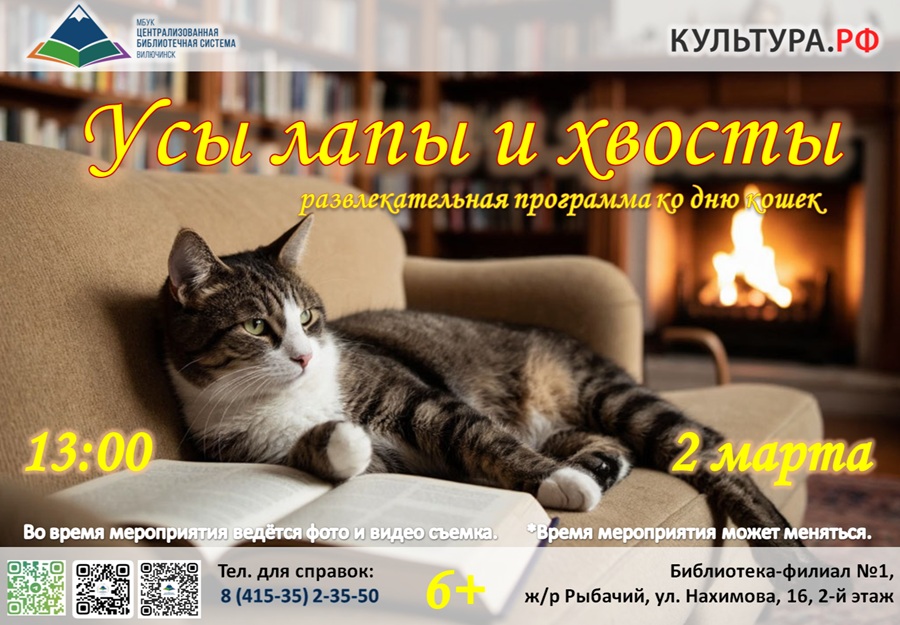 2 марта в 13:00 в библиотеке-филиале № 1 состоится развлекательная программа «Усы, лапы, хвост» ко дню кошек.