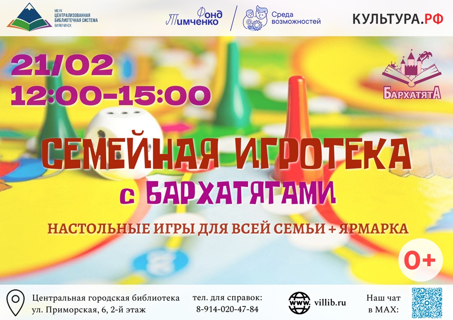 21 февраля с 12:00 до 15:00 Центральная городская библиотека приглашает детей и взрослых провести время за настольными играми вместе с командой проекта «Бархатята» – представителями магазина настольных игр из Петропавловска-Камчатского. Участники мероприятия смогут поиграть в настольные игры, которые увлекают детей и взрослых от 1 года до 90 лет. Ведущие объяснят правила и помогут собрать команды за игровым столом. У каждого гостя будет возможность поиграть как в хорошо знакомые и любимые «настолки» («Доббль», «Уно», «Взрывные котята» и другие), так и познакомиться с новыми. Мероприятие организовано в рамках проекта «Это у нас настольное» при поддержке Фонда Тимченко. Адрес Центральной городской библиотеки: ул. Приморская, 6, 2-й этаж.