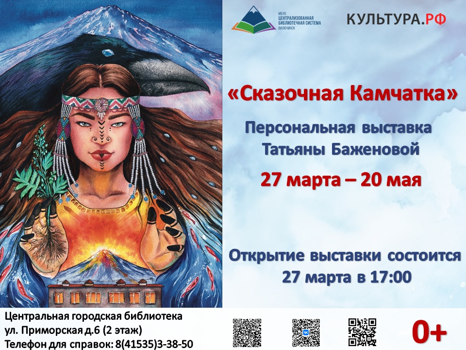 27 марта в Центральной городской библиотеке откроется персональная выставка Татьяны Баженовой. Она родилась и выросла в нашем родном городе Вилючинске. Много лет занималась портретной живописью, а в 2021 году решила показать яркий и красочный мир Камчатки. Создавая образы животных, она наделяет их человеческими чертами, облачает в национальные костюмы коренных жителей Камчатки. Звери, одетые в кухлянку или имеющие ленаты и обручи на голове, выглядывают из камчатских дикоросов, любуются видами вулканов – эти картины позволяют передать автору ее уникальный взгляд художника на мир камчатской природы. В экспозиции представлены картины с изображением животных, растений, морских обитателей и коренных жителей полуострова. Выставка «Сказочная Камчатка» продлится с 27 февраля по 20 мая в Центральной городской библиотеке. Адрес Центральной городская библиотеки: ул. Приморская, 6, 2-й этаж.