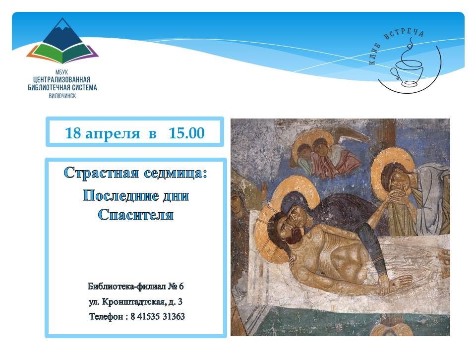 18 апреля в 15:00 в библиотеке-филиале № 6 состоится очередное заседание библиотечного клуба «Встреча» на тему «Страстная седмица: Последние дни Спасителя». Каждый из дней Страстной седмицы посвящён определенной теме, а Страстная пятница – основному событию, произошедшему в этот день. Участники мероприятия поговорят о событиях последней недели земной жизни Иисуса Христа, рассмотрят иконографию. В мероприятии могут принять участие все желающие. Адрес библиотеки-филиала № 6: ул. Кронштадтская, 3. ☎ для справок: 8(415-35) 3-13-63.