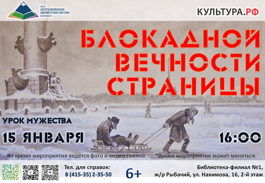 15 января в 16:00 в библиотеке-филиале № 1 пройдёт урок мужества «Блокадной вечности страницы», посвящённый героической обороне и блокаде Ленинграда. Приглашаем всех желающих прикоснуться к одной из самых трагических страниц Великой Отечественной войны. Вы узнаете о мужестве и стойкости ленинградцев, о том, как город жил, сражался и выстоял в нечеловеческих условиях 900-дневной блокады. В программе мероприятия: