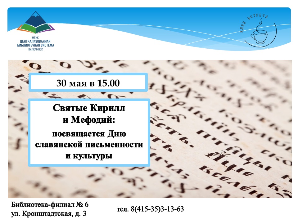 30 мая в 15:00 в библиотеке-филиале № 6 состоится встреча, посвященная Дню славянской письменности и создателям первого славянского алфавита. Суть праздника в честь святых Кирилла и Мефодия – в просветительской деятельности двух греческих миссионеров. Создание литературного славянского языка, письменности, перевод Священного Писания на славянский язык положил начало как славянскому богослужению, так и славянской литературе. Адрес библиотеки-филиала № 6: ул. Кронштадтская, д. 3. ☎ для справок: 8(415-35)3-13-63.