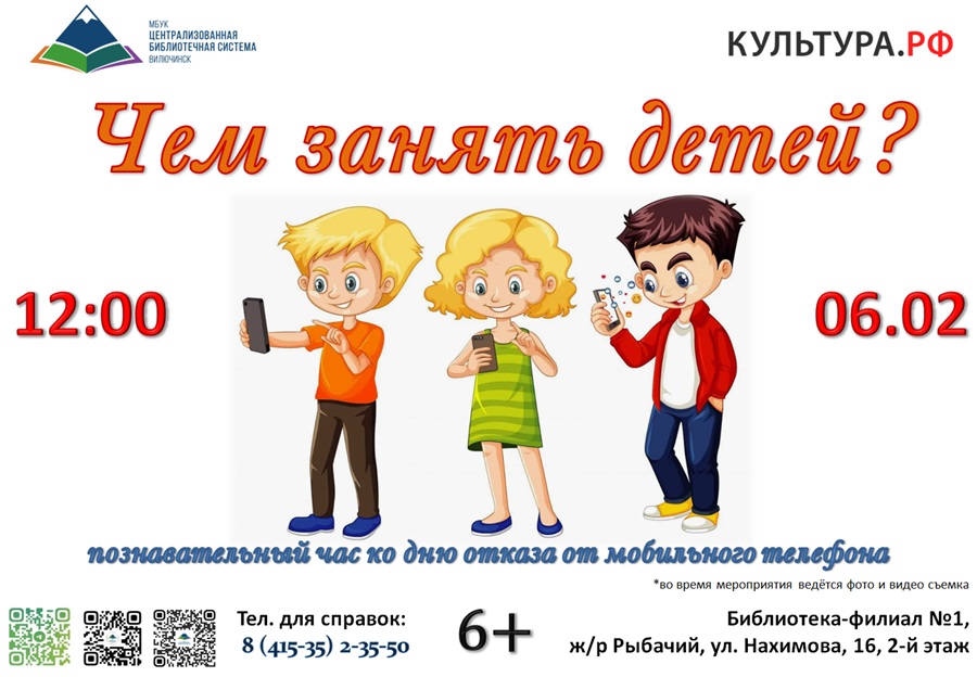 6 февраля в 12:00 ко Всемирному дню отказа от телефона в библиотеке-филиале № 1 состоится занимательный час «Чем занять детей?». Библиотекари приглашают родителей и детей на увлекательное мероприятие, где каждый найдёт идеи для полезного и интересного досуга без гаджетов. Мы покажем, что живое общение, творчество и игры «в реале» могут быть не менее захватывающими, чем экранные развлечения. В программе занимательного часа: Приходите всей семьёй – откроем мир увлекательных занятий без телефонов! Адрес библиотеки-филиала № 1: ул. Нахимова, 16, 2-й этаж.