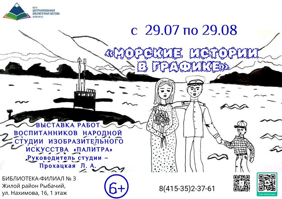 С 29 июля по 29 августа библиотека-филиал № 3 приглашает посетить выставку творческих работ воспитанников Народной студии изобразительного искусства «Палитра» под руководством Прохацкой Л.А. Юные художники в своих рисунках, выполненных в технике «графика», рассказывают о жизни моряков-подводников, о таинственных глубинах моря и о радостных встречах с семьей после долгой разлуки. Детская фантазия превращает подводные лодки в грациозных косаток, а море в волшебный мир. Выставку можно посетить в часы работы библиотеки. Адрес библиотеки-филиала № 3: ул. Нахимова,16, 1-й этаж. ☎ для справок: 8(415-35)2-37-61.