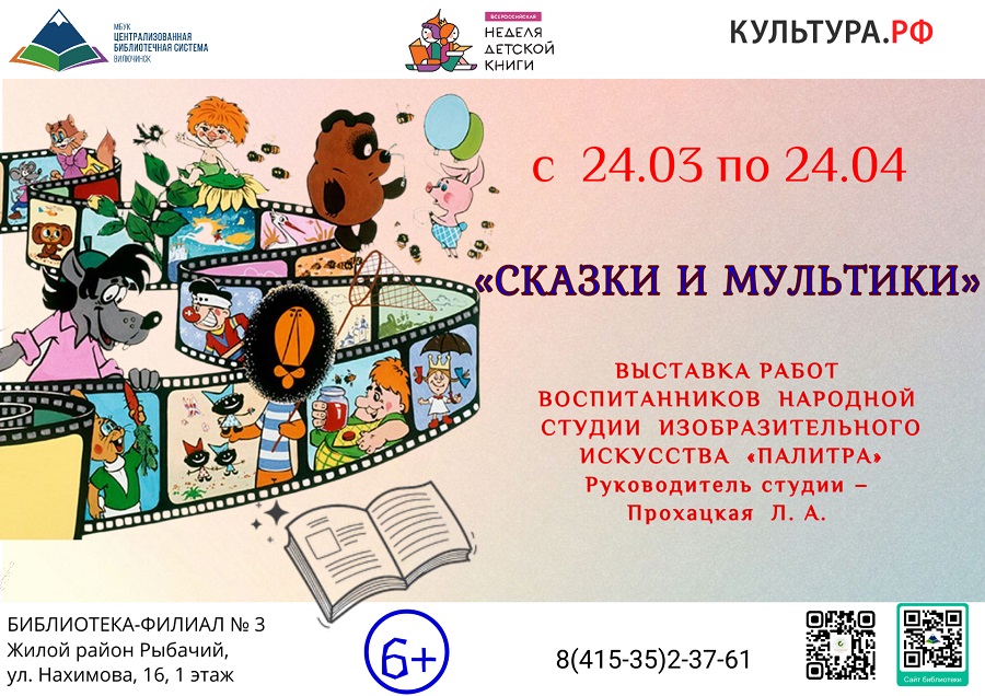 С 24 марта по 24 апреля библиотека-филиал № 3 приглашает посетить выставку «Сказки и мультики» Народной студии изобразительного искусства «Палитра» Дома офицеров флота. Юные художники приглашают совершить увлекательное путешествие по страницам любимых сказок и мультфильмов. В экспозиции представлены рисунки, на которых оживают знакомые с детства персонажи. Каждая работа – это маленькая история, рассказанная языком цвета и формы. Ребята не просто перенесли на бумагу образы любимых героев, но и наполнили их своим видением, эмоциями и чувствами. Выставка станет настоящим праздником для всей семьи. Маленькие посетители узнают любимых персонажей, а взрослые смогут на время вернуться в беззаботное детство и вспомнить свои первые встречи с героями сказок и мультфильмов. Выставку можно посетить в часы работы библиотеки. ☎ для справок: 8(415-35)2-37-61. Адрес библиотеки-филиала № 3: ул. Нахимова, 16, 1 этаж.