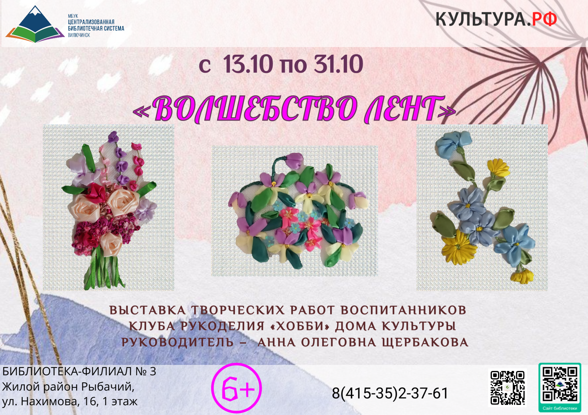 С 13 по 31 октября 2025 г. библиотека-филиал № 3 приглашает на выставку «Волшебство лент» Эти чудесные работы созданы юными мастерами из клуба «Хобби» Дома Культуры под руководством Анны Олеговны Щербаковой. В экспозиции вы увидите нежные лепестки из шелковых лент, кропотливо вышитые руками начинающих волшебников. В каждой работе – частичка души и огромное желание творить красоту. Если вам хочется чего-то необычного и вдохновляющего, приходите в библиотеку. Это отличная возможность получить массу положительных эмоций. ☎ для справок: 8 (415-35) 2-37-61
