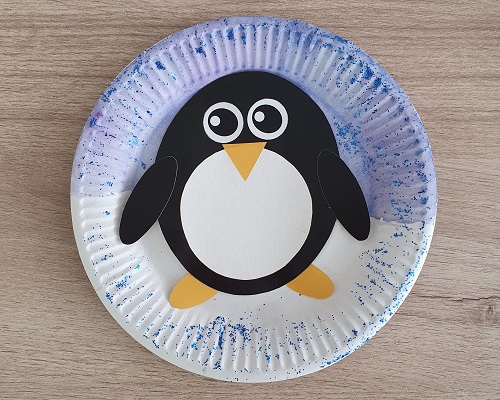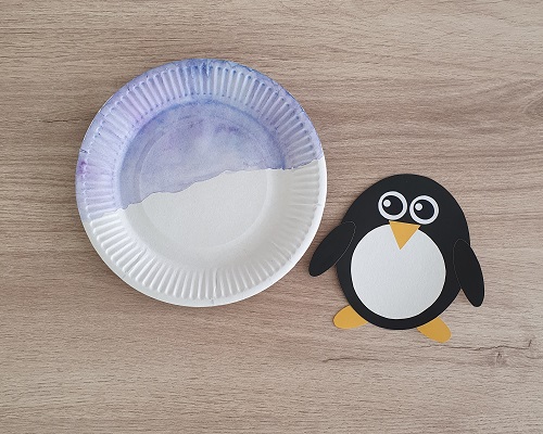 - Загрузите шаблон с пингвином, распечатайте и вырежьте нужные вам части или обведите чёрно-белый вариант шаблона на цветном картоне и вырежьте. Раскрасьте половину тарелки.