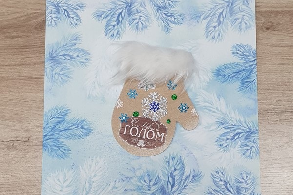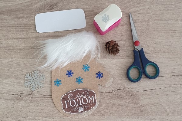 2. Фигурным степлером вырежьте снежинки из блестящей бумаги. Вырежьте надпись из листа бумаги для скрапбукинга и наклейте поверх варежки или напишите самостоятельно. Далее наклейте снежинки, маленькие стразы. Возможно, в ваших запасах рукодельницы найдутся ещё очаровательные детали, которые можно будет использовать для этой открытки. Главное – не бояться проявить фантазию и рукавица Деда Мороза получится праздничной и уникальной!