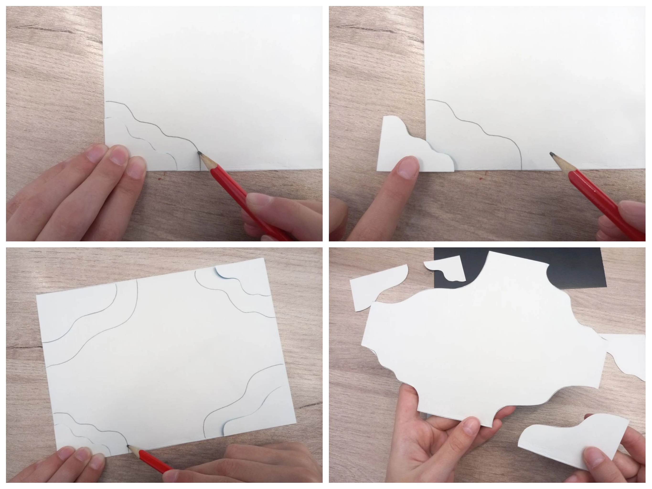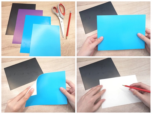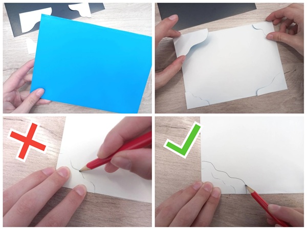 Порядок работы: 1. Подберите цвета для космоса. Первый цвет должен быть обязательно чёрным. Это будет основа нашей открытки. Остальные три цвета подбираем следующим образом: в порядке радуги от самого тёмного – фиолетового, до самого светлого – жёлтого. Предложите детям самим попробовать подобрать цвета. Самостоятельный подбор цветов в творчестве – это не просто вопрос красоты, а важный этап. 2. Возьмите простой карандаш и самый светлый лист картона. Переверните его на обратную – не цветную сторону, если картон односторонний. 3. Нарисуйте в углах волнистые линии. У вас должны получиться небольшие уголки. 4. Берём ножницы и вырезаем эти уголки.