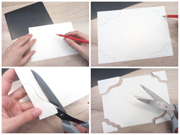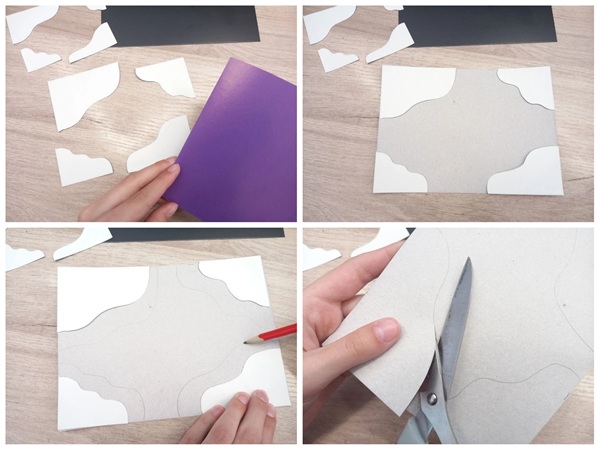 5. Берём более тёмный лист картона, переворачиваем его и располагаем маленькие светлые уголки ровно в углах.