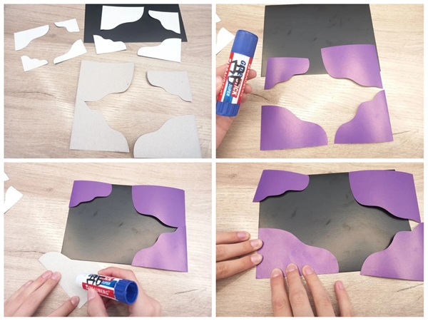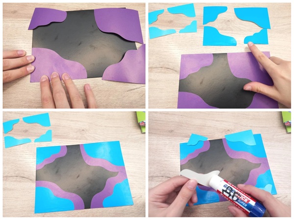 11. Берём клей, чёрную основу открытки и 4 самых больших тёмных уголка.